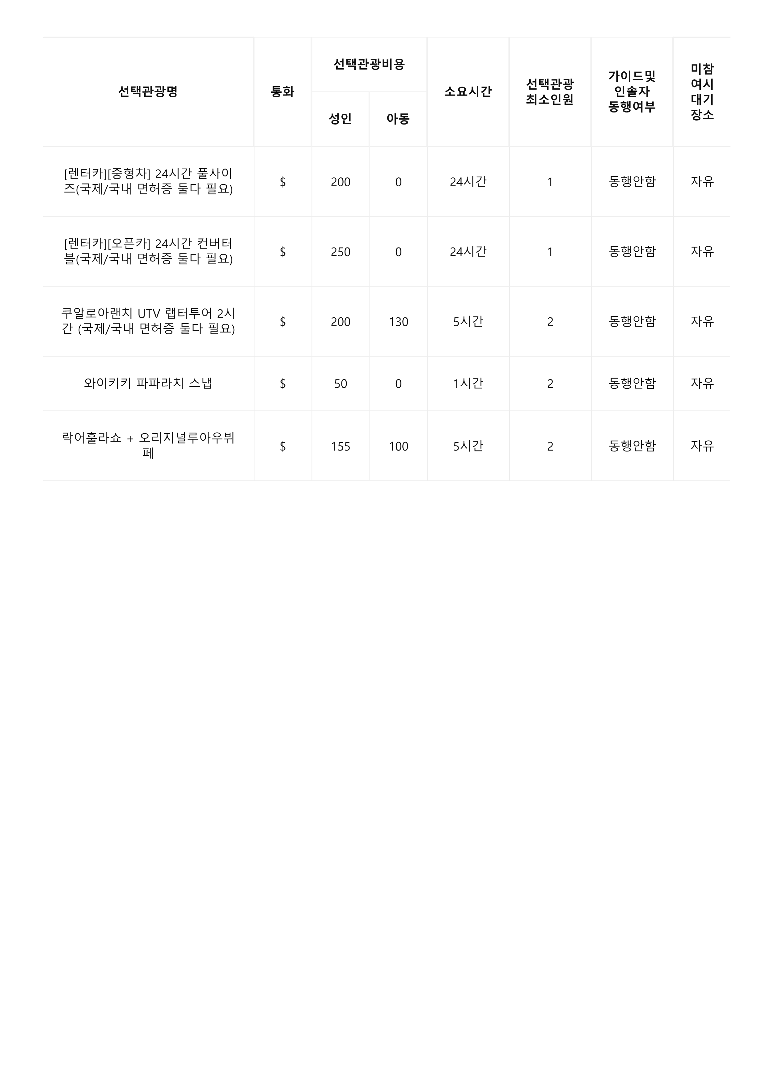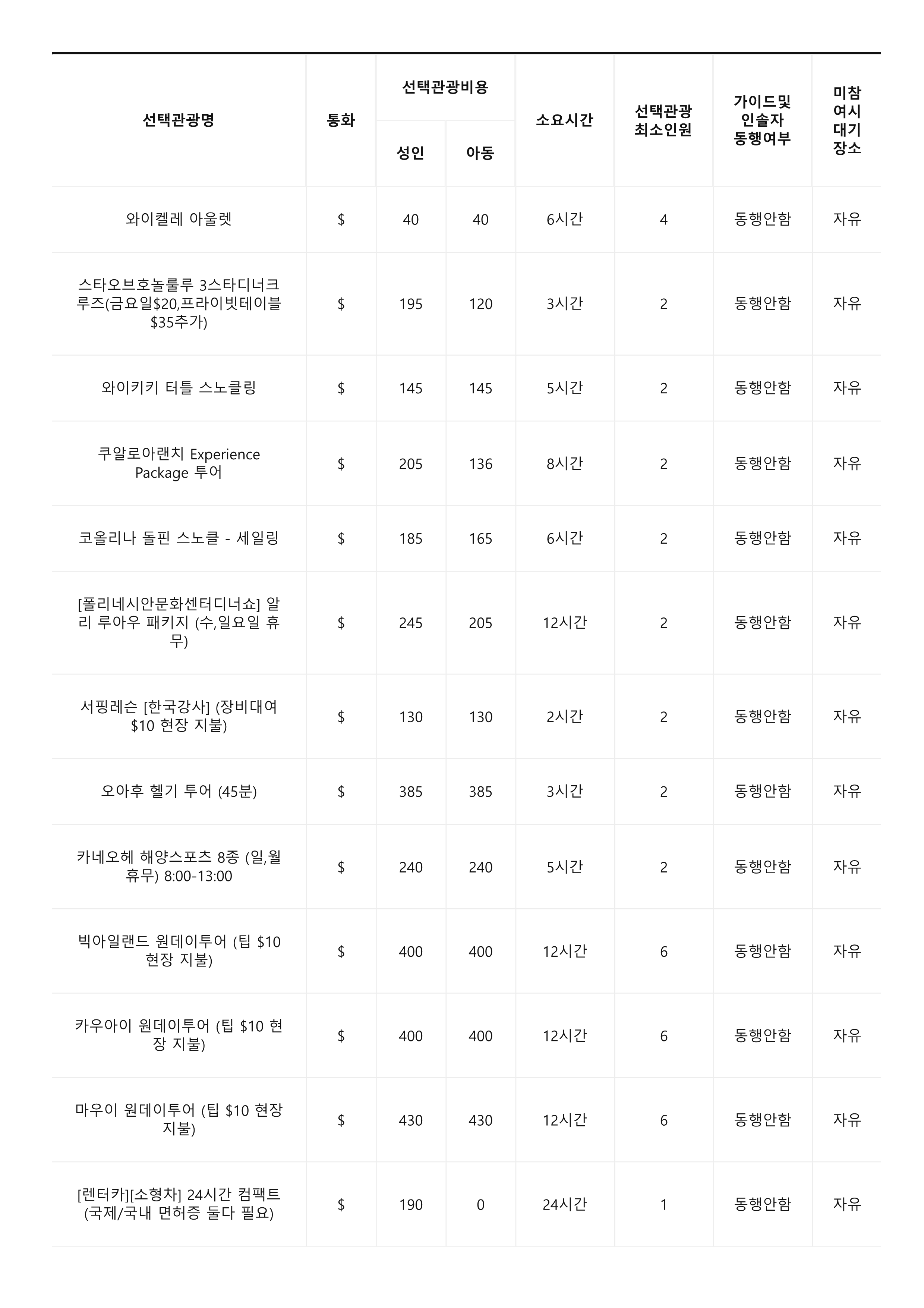 - 선택 관광은 현지업체/현지가이드로 진행되며 안전교육 또한 영어로 진행됩니다. ( 하나우마베이, 스카이다이빙, 스쿠버다이빙, 쿠알로아랜치, 헬기투어, 돌핀스노클링 등 )