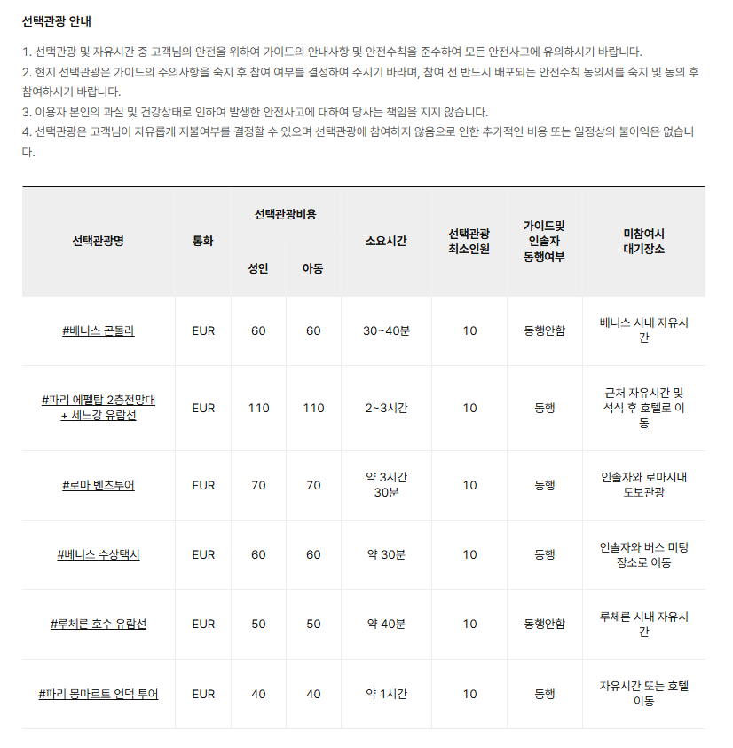 ■ 기타 개인 경비 (물을 포함한 음료, 주류, 선택관광 등)