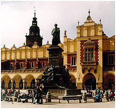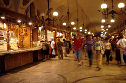 중앙시장 광장은 크라코프의 사교장으로서의 역할을 했던 곳이다. 구시가지의 중앙에 위치하고 있으며, 총 4만m²로 베니스의 산 마르코 광장 다음으로 유럽에서 두번째로 넓은 광장이다. 주위에는 옛 크라코프 귀족들의 저택이 줄지어 있다. 광장 중앙의 건물은 직물 회관으로 고딕 양식에 르네상스 양식이 혼합된 건물이다. 직물 회관안에는 관광객들이 기념품을 살 수 있는 많은 잡화점이 있다. 직물 회관에는 18,19세기의 폴란드 조각과 회화 작품들이 전시되어 있는 국립박물관의 일부가 있다. 시장옆쪽에 있는 "Bei Noworol"이라는 카페에서는 민속 예술품같은 각 시기의 가구들을 구경할 수 있다. | |