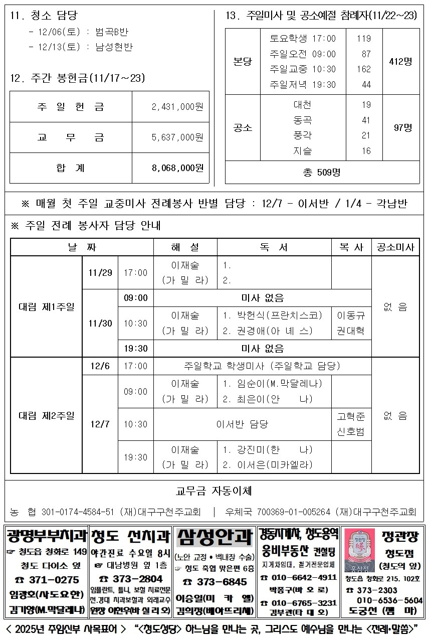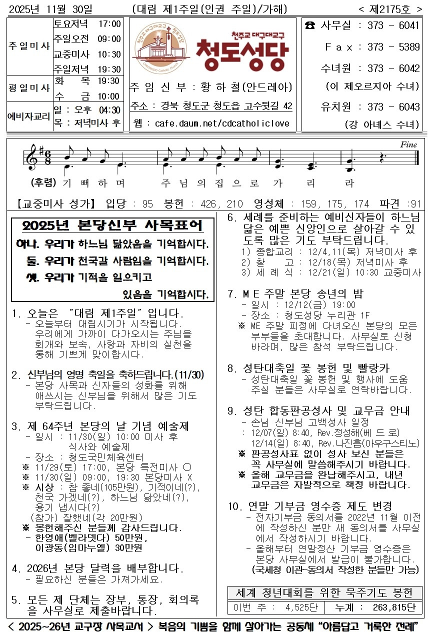 청도주보(11/30-대림 제1주일) 작성자사무장|작성시간25.11.28|조회수89 목록 댓글 0 글자크기 작게가 글자크기 크게가 청도주보 2025.11-30(대림 제1주일).pdf222.46KB 첨부파일첨부된 파일이 3개 있습니다. jpg 파일 청도주보 2025.11-30(대림 제1주일)001.jpg 다운로드 jpg 파일 청도주보 2025.11-30(대림 제1주일)002.jpg 다운로드 pdf 파일 청도주보 2025.11-30(대림 제1주일).pdf 다운로드 다음검색 현재 게시글 추가 기능 열기 북마크 신고 센터로 신고 댓글 댓글 0 댓글쓰기 답글쓰기 댓글 리스트