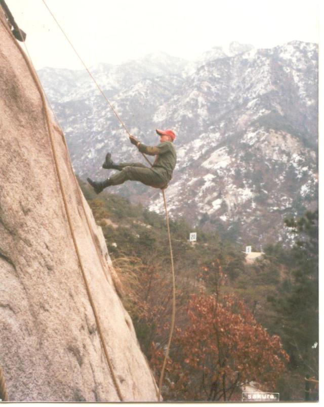 시범조교의 암벽레펠 하강준비끝 .