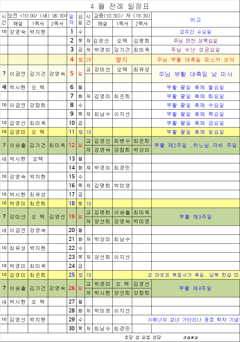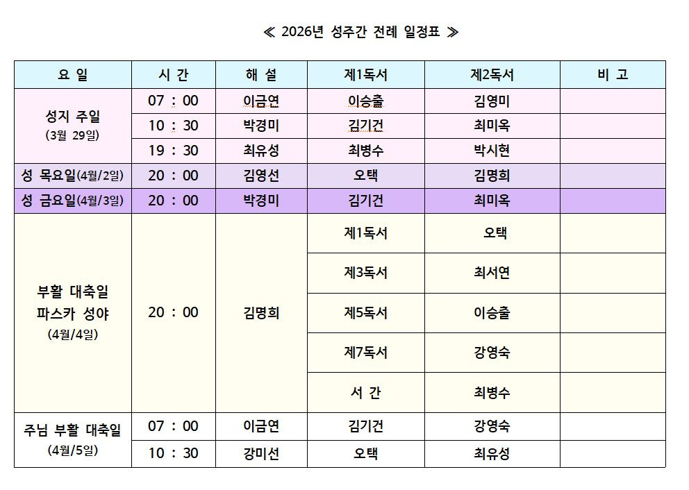 2026년 4월 전례표 ,성주간 전례일정표 작성자전례분과|작성시간26.03.30|조회수16 목록 댓글 0 글자크기 작게가 글자크기 크게가 다음검색 현재 게시글 추가 기능 열기 북마크 공유하기 신고 센터로 신고 댓글 댓글 0 댓글쓰기 답글쓰기 댓글 리스트