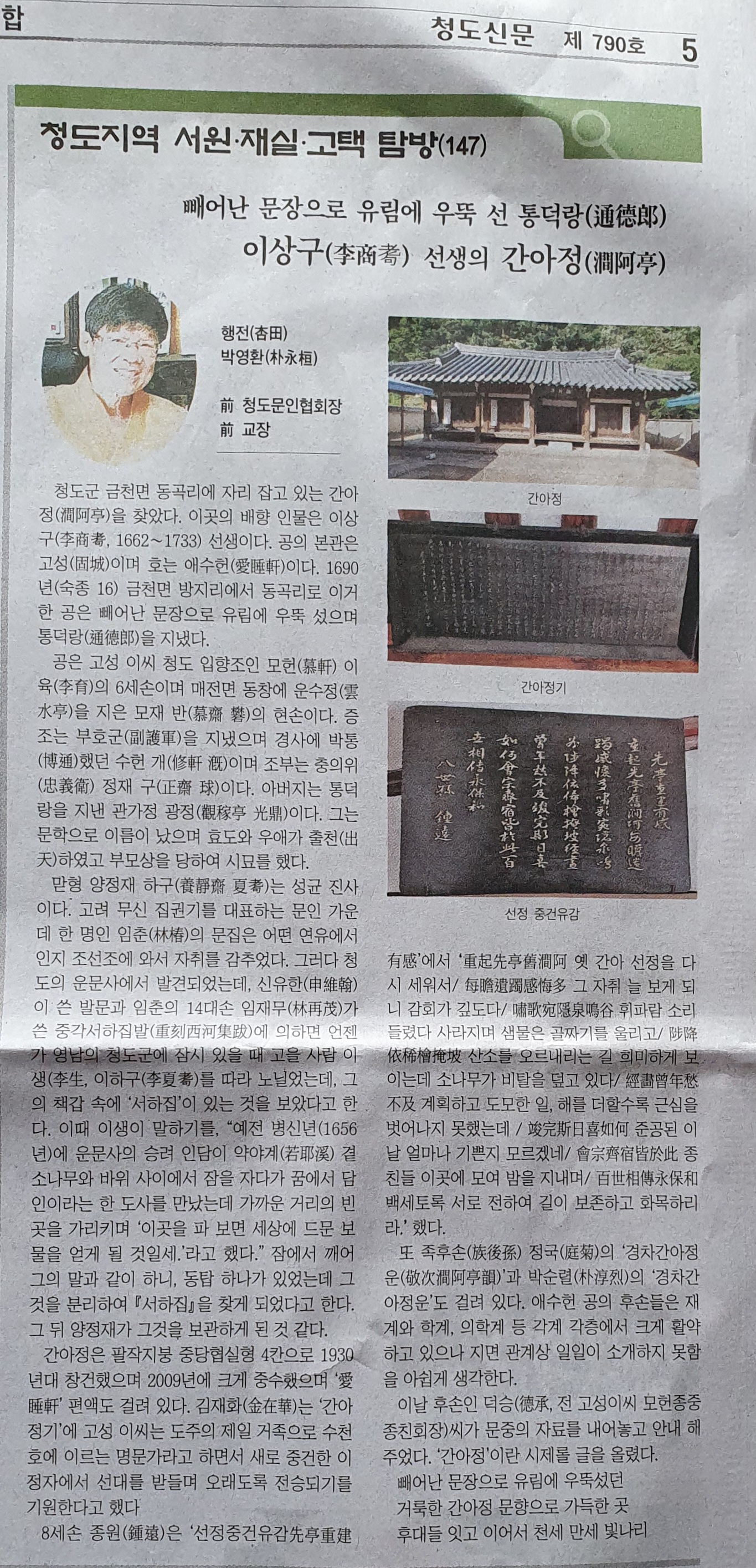청도 지역 서원•재실•고택 탐방(147) 빼어난 문장으로 유림에 우뚝 선 통덕랑(通德郞) 이상구(李商耈) 선생의 간아정(澗阿亭)