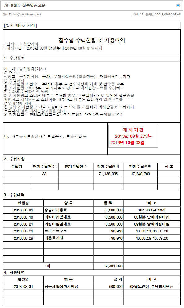 잡수입 수납현황 및 사용내역(2013년 8월) 작성시간13.10.04|조회수59 목록 댓글 1 글자크기 작게가 글자크기 크게가 다음검색 현재 게시글 추가 기능 열기 북마크 신고 센터로 신고 댓글 댓글 1 댓글쓰기 답글쓰기 댓글 리스트 작성시간 13.10.23 어린이집 임대료 수익이 잡수입 맞나요? 댓글 전체보기