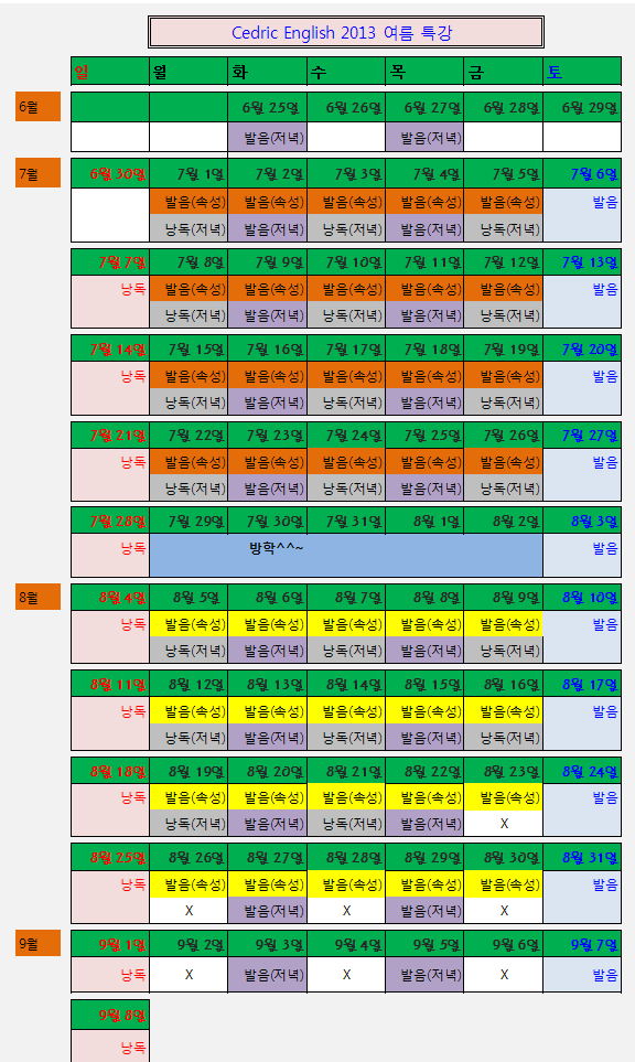 안녕하세요, 2013년 여름 방학 시간표와 학사일정이 나왔습니다.