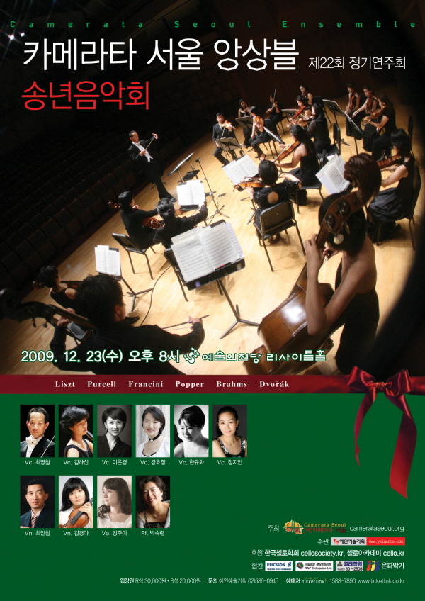금번 2009년 송년음악회에서는 전반에는 6대의 첼로가 아름다운 소품들을 중후함으로 인도하며, 후반에는 브람스의 피아노 퀸텟 f minor가 저물어가는 올해의 아쉬움을 실내악의 깊고 서정적인 선율로 달래줄 것이다.