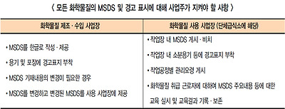 물질안전보건자료(MSDS) 일부 항목의 순서와 내용, 위험성 분류기준과 경고 표시(그림문자) 등이 변경 됐다. 하지만 이에 대한 전문적 교육도 없이 처벌만이 강조돼 단체급식 관계자들의 혼란이 가중되고 있다.
