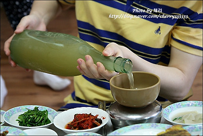 상이 좁아서 밥 뚜껑을 덮은 후 술잔을 위에 놓고