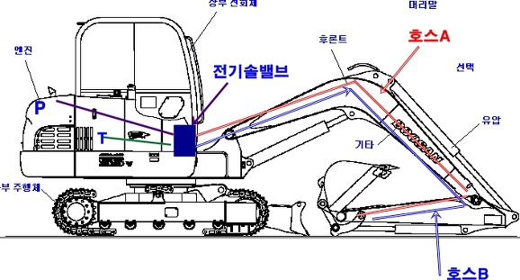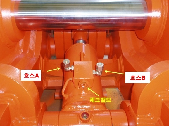 그러면 앞의 붐,암대로 연결된 호스 A,B가 육안으로 움직이는지를 먼저 확인 하십시오.