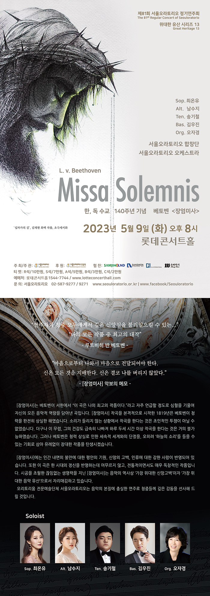| 2023년 5월 9일(화) 오후 8시, 서울 롯데콘서트 홀(잠실) - 베토벤의 영혼 "함께 노래하다" 베토벤 [ 장엄미사, MISSA SOLEMNIS] 지 휘 : 최영철 소프라노 : 최온유 알 토 : 남수지 테 너 : 송기철 베 이 스 : 김우진 오 르 간 : 오자경 서울오라토리오 합창단 / 서울오라토리오 오케스트라 지난 2022년 10월 16일 독일 베를린 필하모닉홀에서 서울오라토리오 감독 최영철의 지휘로 한-독 공동음악회(서울오라토리오-베를리너 징아카데미(Berliner Singakademie)를 성공적으로 마친 서울오라토리오가 이번에는 한-독 수교 140주년을 맞아 5월 9일(화) 8:00pm 롯데콘서트홀에서 베토벤(L.v.Beethoven) [장엄미사-Missa Solemnis]를 선보인다. 특히, 이번 공연은 철저히 연구하고 분석된 연주를 하기 위하여 역량있는 성악가들을 오디션을 통해 선발하였고 5대1의 경쟁률을 통해 선발된 솔로이스트들과 합창단, 오케스트라가 연구하고 분석된 내용으로 베토벤이 ‘장엄미사’를 통해 표현하고자 했던 신에 대한 그의 음악적 이상을 보여줄 수 있는 공연이 될 것이다. [장엄미사]는 베토벤이 서한에서 “이 곡 장엄미사는 나의 최고의 작품이다.”라고 자주 언급할 정도로 심혈을 기울여 자신의 모든 음악적 역량을 담아낸, 유례없이 장대한 작품이다. [장엄미사]는 인간 내면의 불안에 대한 평안의 기원, 신앙의 고백, 인류에 대한 강한 사랑을 반영한 곡이다. 또한 이 곡은 한 시대의 정신을 반영하는데 머무르지 않은, 전통적이면서도 매우 독창적인 작품이다. [장엄미사]가 지니는 가장 큰 특징은 시공을 초월한 끊임없는 생명력이다. 음악의 역사가 탄생시킨 이 걸작이야말로 “가장 위대한 음악유산”이라고 할 수 있다. [장엄미사]는 베토벤 자신도 가장 위대한 작품으로 간주하였던 것처럼, 인류 최고의 문화유산으로 손꼽히기에 손색이 없는 작품으로, 그의 후기 작품에 속한다. 베토벤의 후원자요 제자였던 루돌프 대공이 1829년 모라비아의 올뮈츠(현재의 체코) 대주교로 서임된 것을 경축하기 위해 1818년 작곡을 시작하여, 1823년에 완성·헌정하였다. 이 곡을 작곡하기에 앞서 베토벤은 라틴어 가사의 정확한 억양을 익히고 단어의 의미에 관하여 수많은 주석을 달았으며, 옛 악보와 전례절차에 대한 저서를 찾기 위하여 로프코비츠와 루돌프의 장서를 샅샅이 살피는 등 미사곡에 대한 철저한 고증을 하였다. 작곡가 첼터에게 보낸 한 편지에서 “진정한 교회양식은 오로지 팔레스트리나와 그 시대 사람들의 아카펠라 양식뿐이라고 생각한다.”라고 했던 것처럼, 팔레스트리나와 헨델이 이루어 놓은 교회음악의 전통을 지키면서 개인적이면서도 보편적인 신앙고백을 이 곡에 담아내고자, 미사 원문의 연구, 그레고리오 성가와 그 이후의 교회음악을 철저히 탐구하였다. 그의 이러한 노력은 이 무렵의 일기장에 담긴 기록에서도 알 수 있다. “참다운 교회음악을 작곡하기 위해서는 수도원의 옛 교회음악을 탐구할 것, 모든 가톨릭 시편이나 성가 전반의 완전한 시형(詩形), 가장 올바른 번역에 있어서 원문의 도막 짓는 법을 연구할 것.” 나라 안팎으로는 나폴레옹 전쟁 역사의 한 가운데에서, 개인적으로는 청력을 완전히 잃어버리고 극도로 악화된 건강 상태, 경제적 궁핍, 조카 카를의 후견문제 등 삶의 고통스러운 문제들 속에서 <장엄미사>는 탄생되었다. 그는 ‘예술을 위한 희생’이라는 사명감으로 자신의 불행한 삶을 승화시켜 가장 최상의 작품으로 신에 대한 감사를 표현하였다. 이 곡은 미사 통상문에 따라 5곡으로 이루어졌으며, 혼성4부의 독창과 합창, 2관 편성에 바탕을 둔 관현악과 오르간에 의해 연주된다. |
