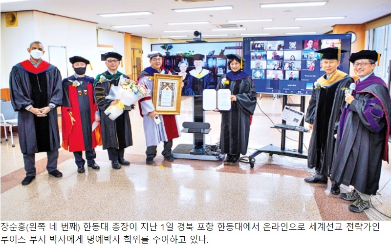 장순흥(왼쪽 네 번째) 한동대 총장이 지난 1일 경북 포항 한동대에서 온라인으로 세계선교 전략가인 루이스 부시 박사에게 명예박사 학위를 수여하고 있다.
