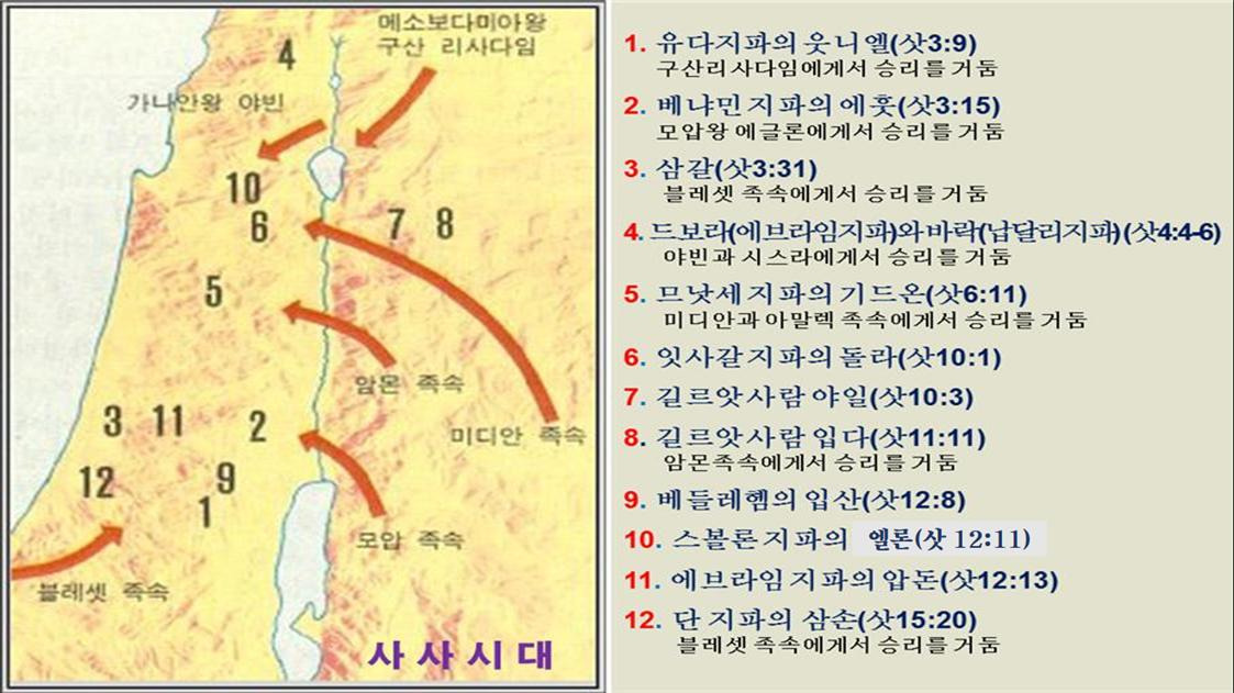 * **기타 사사 시대의 시험 (12:8∼15):** 입산, 엘론, 압돈 등 소규모 사사들의 이야기는 사사 시대 전체의 연대기를 이어줍니다.