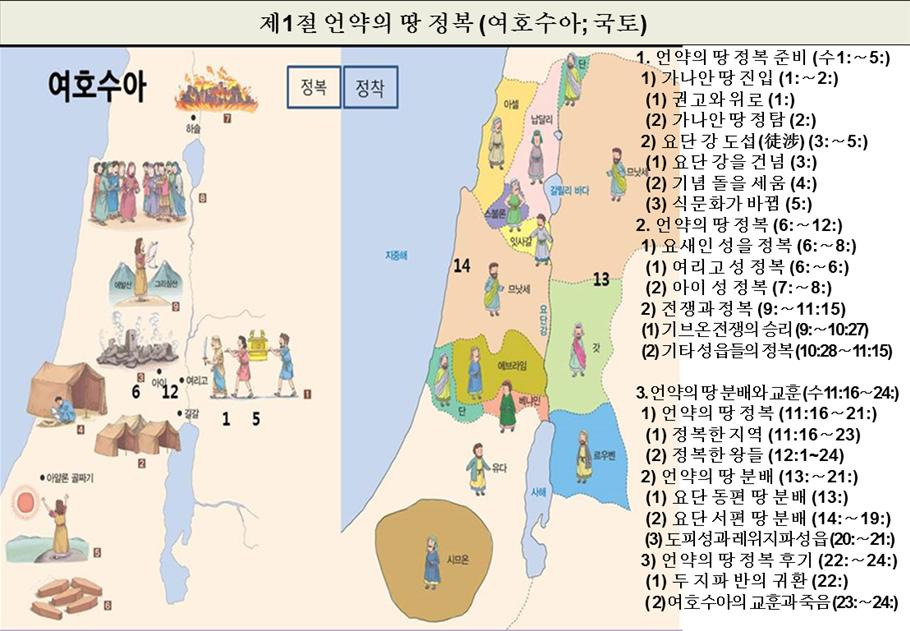 가나안 땅 정복 후 땅을 분배하고 여호수아의 마지막 유언을 통해 언약 백성이 지켜야 할 도리를 가르칩니다.