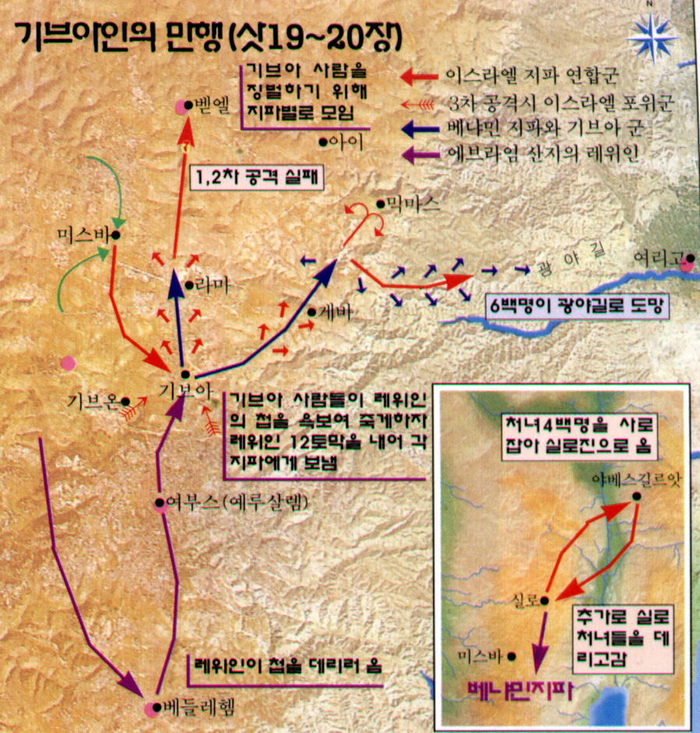 * **고발과 골육상잔 (19:27~20:):** 레위인이 첩의 시체를 열두 지파에게 보내어 그 비참한 사건을 고발하자, 이스라엘 지파들은 베냐민 지파와 전쟁을 벌입니다. 이 동족 상잔의 비극은 왕이 없어서 각자가 자기 소견에 옳은 대로 행했을 때 초래될 수 있는 최악의 결과를 보여줍니다. 이는 하나님의 법과 질서가 무너졌을 때 공동체가 얼마나 파괴될 수 있는지를 나타냅니다.