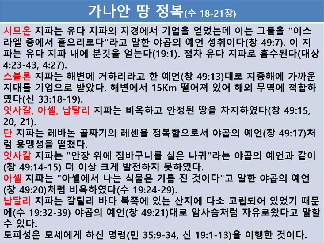 * **미 정복지 분배 (18:∼19:):** 아직 정복되지 않은 땅에 대한 분배는, 언약 백성에게 남아있는 사명을 상기시킵니다. 이는 신약 시대의 성도들이 영적인 싸움을 계속하며(엡 6:12) 미완성된 하나님의 나라를 이루어갈 책임을 보여주는 듯합니다.