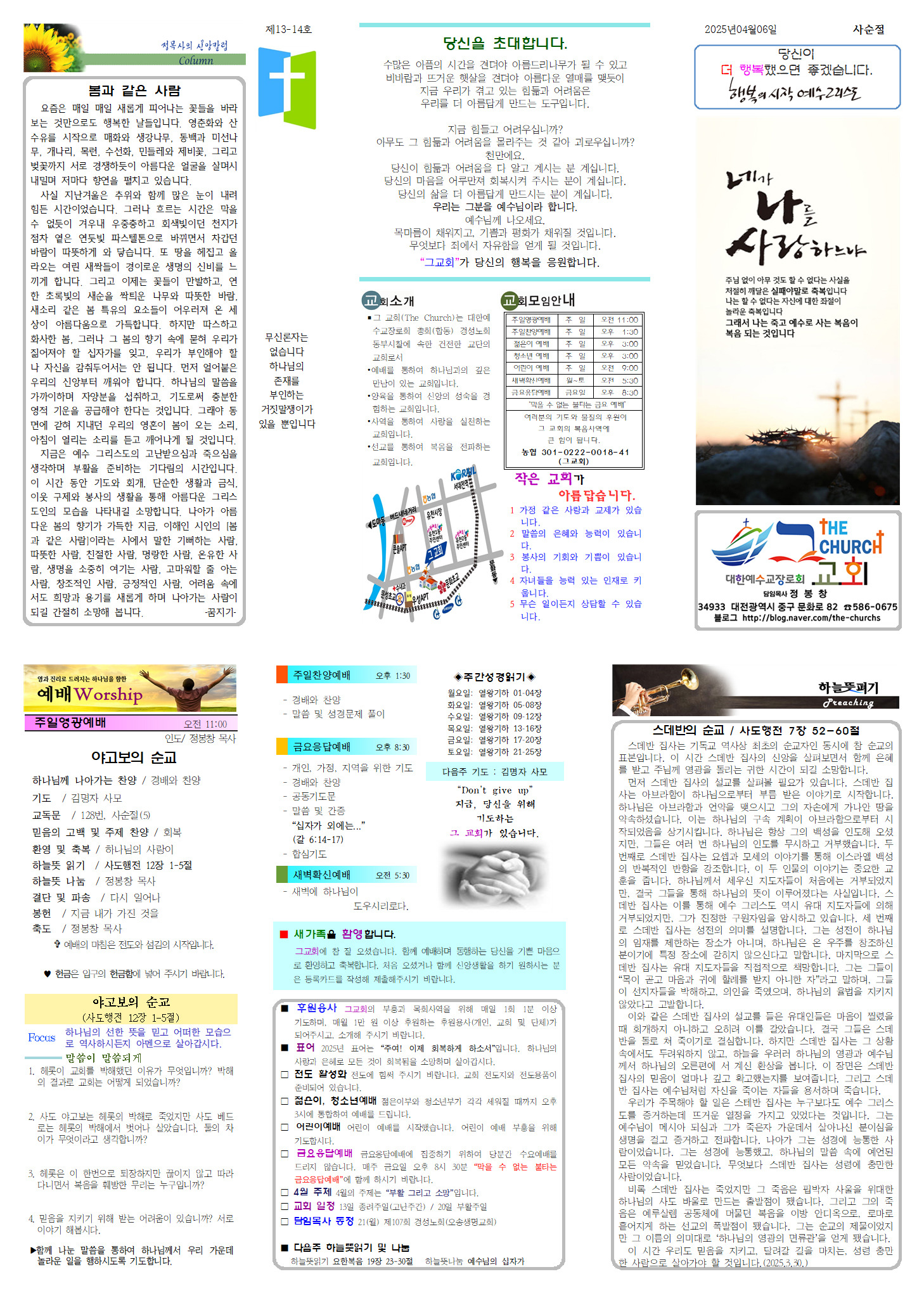 사실 지난겨울은 추위와 함께 많은 눈이 내려 힘든 시간이었습니다. 그러나 흐르는 시간은 막을 수 없듯이 겨우내 우중충하고 회색빛이던 천지가 점차 옅은 연둣빛 파스텔톤으로 바뀌면서 차갑던 바람이 따뜻하게 와 닿습니다. 또 땅을 헤집고 올라오는 여린 새싹들이 경이로운 생명의 신비를 느끼게 합니다. 그리고 이제는 꽃들이 만발하고, 연한 초록빛의 새순을 싹틔운 나무와 따뜻한 바람, 새소리 같은 봄 특유의 요소들이 어우러져 온 세상이 아름다움으로 가득합니다. 하지만 따스하고 화사한 봄, 그러나 그 봄의 향기 속에 묻혀 우리가 짊어져야 할 십자가를 잊고, 우리가 부인해야 할 나 자신을 감춰두어서는 안 됩니다. 먼저 얼어붙은 우리의 신앙부터 깨워야 합니다. 하나님의 말씀을 가까이하며 자양분을 섭취하고, 기도로써 충분한 영적 기운을 공급해야 한다는 것입니다. 그래야 동면에 갇혀 지내던 우리의 영혼이 봄이 오는 소리, 아침이 열리는 소리를 듣고 깨어나게 될 것입니다.