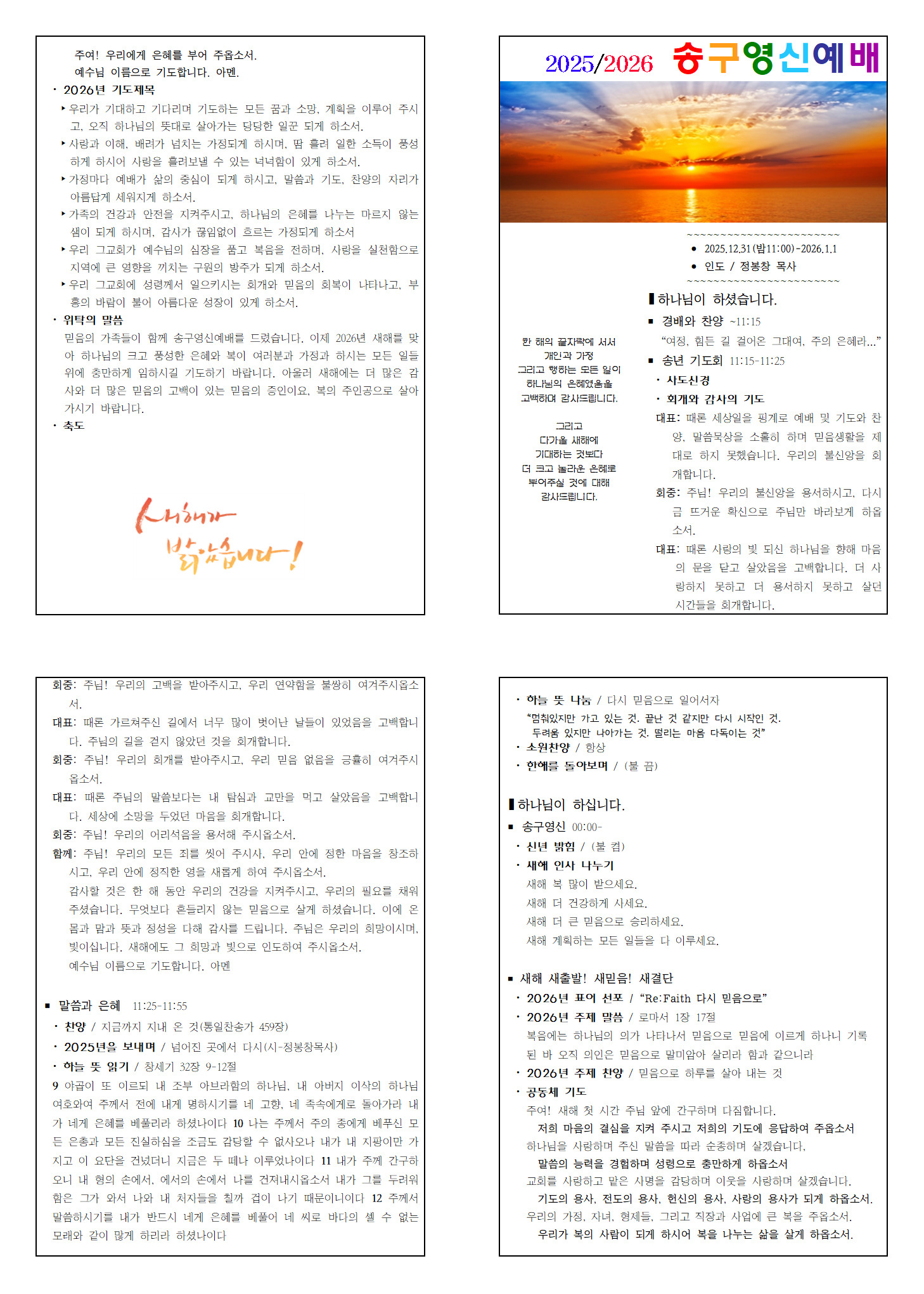 2025년 송구영신 예배 순서지 작성자그교회|작성시간25.12.27|조회수63 목록 댓글 0 글자크기 작게가 글자크기 크게가 다음검색 현재 게시글 추가 기능 열기 북마크 공유하기 신고 센터로 신고 댓글 댓글 0 댓글쓰기 답글쓰기 댓글 리스트