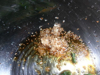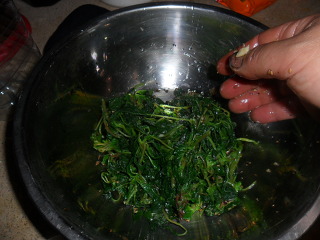 집간장2스픈 참기름.마늘 통깨를 넣고 손으로 바락바락 무쳐 준다