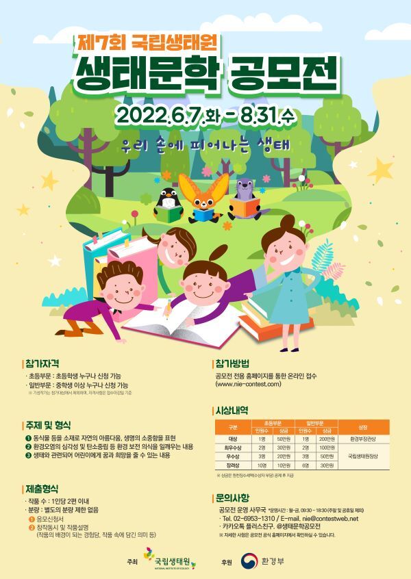 | 올해로 7회째 개최하고 있는 생태문학 공모전은 해마다 동화와 동시 분야가 순차적으로 진행됨을 알려드리며, 올해 “제7회 국립생태원 생태문학 공모전”은 동시분야에 대해 접수를 받습니다. 앞으로 ‘국립생태원 생태문학 공모전’에 많은 관심과 사랑을 부탁드립니다. |