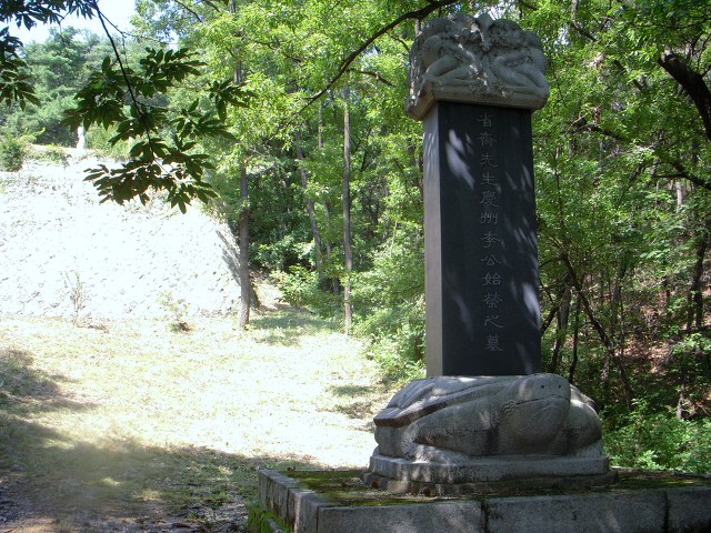 거대한 비석이 있고 오른편에 홍살문이 있다