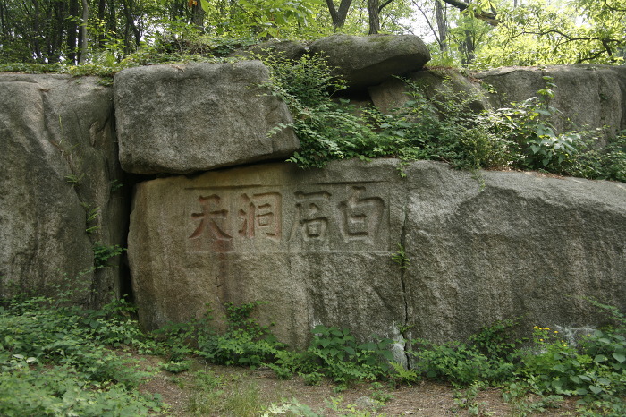 지난번에 우리보다 나이가 더 드신 분들과 이런 저런 얘기를 하며 오르다 따라간 것이 길이 잘못되어 백석 동천이다 이곳은 백악(북악산)의 빼어난 경치를 유지 관리하던 별서가 있던 자리로 지금은 白石洞天이란 암각된 글자만 남아있다