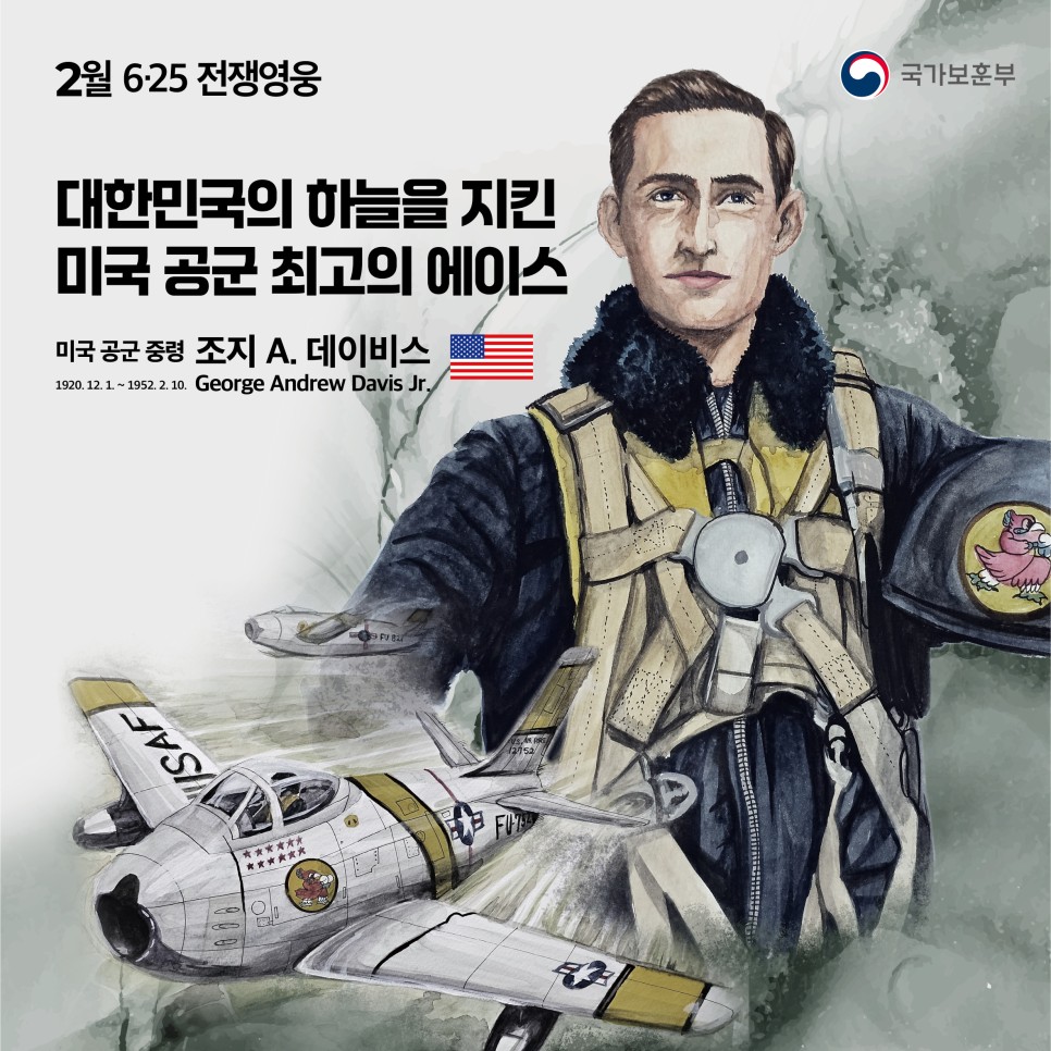 국가보훈부는 조지 앤드류 데이비스 주니어 미국 공군 중령(당시 소령)을 ‘2024년 2월의 6‧25전쟁영웅’으로 선정했습니다. 그는 6‧25전쟁 중 미국 제4전투요격비행단에서 총 60차례 작전 임무를 수행하며 적기* 14기를 격추했습니다.
