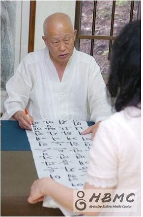 불자들이 써 온 글씨를 점검하는 원법 스님