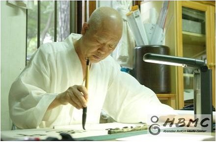 글을 한자 한자 사전에서 찾은 뒤 습자지에 한 획 한획 이서했다. 그런다음 한글을 붙인 뒤, 옆의 송강 스님에게 다시 확인하게 한 뒤에야 화선지를 펴게했다.