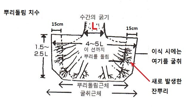 근분의 크기는 뿌리 상태에 따라 다르지만 직경이 근원직경의 4~5배, 길이가 수간 근원직경의 1.5~2.5배 필요하다.