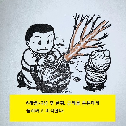 그리고 이식시 절취부에서 나온 세근을 다치지 않도록 그 외측을 파고, 녹화마대 등으로 근분을 덮어 견고하게 하고 뿌리감기를 해서 이식한다.
