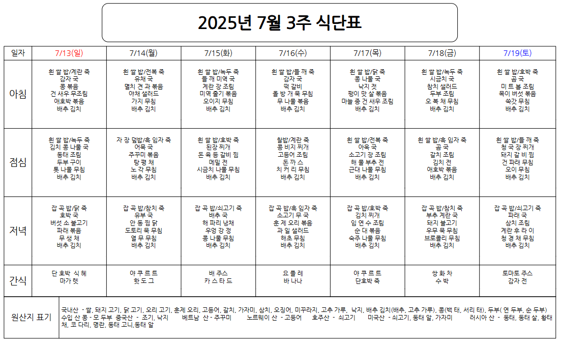 2025년 7월 3주차 식단표 작성자박완희|작성시간25.07.08|조회수28 목록 댓글 0 글자크기 작게가 글자크기 크게가 다음검색 현재 게시글 추가 기능 열기 북마크 신고 센터로 신고 댓글 댓글 0 댓글쓰기 답글쓰기 댓글 리스트