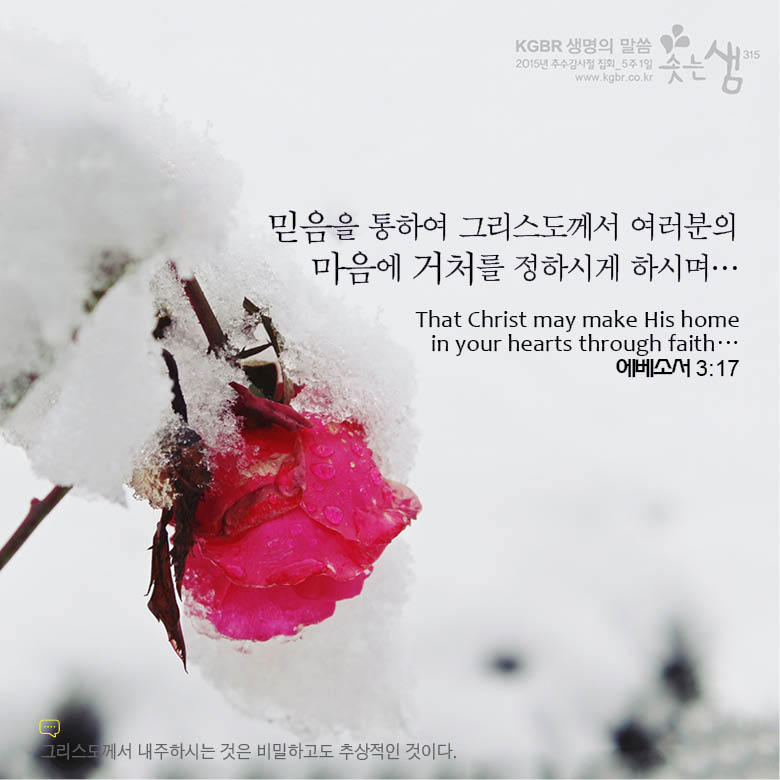“그러므로 나는 무릎을 꿇고 아버지께 빕니다. 아버지는 하늘과 땅에 있는 각 족속에게 이름을 주신 분이십니다. 그분의 풍성한 영광으로, 그분의 성령을 시켜, 여러분의 속사람을 능력으로 강건하게 해주시고, 믿음으로 말미암아 그리스도를 여러분의 마음속에 머물러 계시게 해주시기를 빕니다.