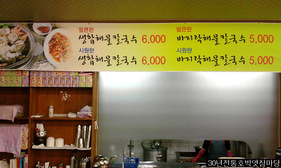 우선들어가서 자리에 앉게되면 방금무친 겉저리김치를 내놓고 주문을 받는데요 생합해물칼국수와 바지락해물칼국수가 있는데요 나는 생합해물칼국수를 시켰습니다. 바지락칼국수와 가격은1,000원 차이인데 생합해물칼국수 국물맛이 깊이가 있었습니다.