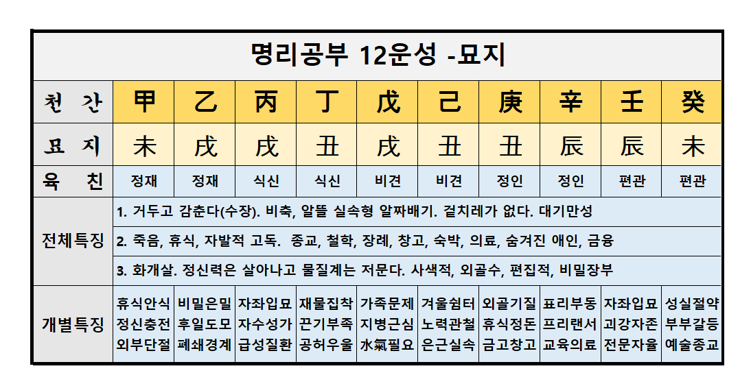 이상 각 천간이 묘지를 만났을때 어울리는 직업,진로,성향이었구요