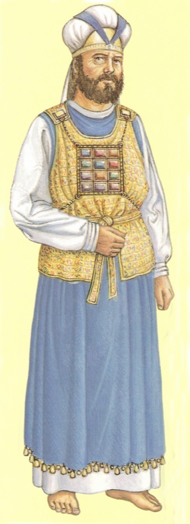 흉패(가슴받이), 에봇, 겉옷, 반포 속옷(수 놓은 저고리), 관(쓰개), 허리띠를 금과 자색과 다홍실, 아마실로 만듦(탈출 28,1-5 참조).
