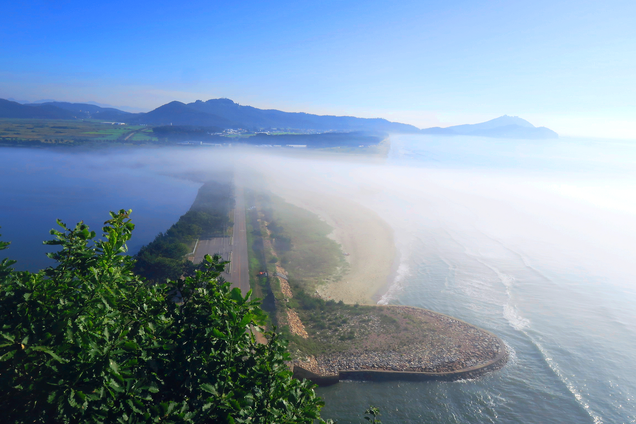 방조제 우측 해무낀 해변이 사곧해안 천연비행장 모래백사장 이다.