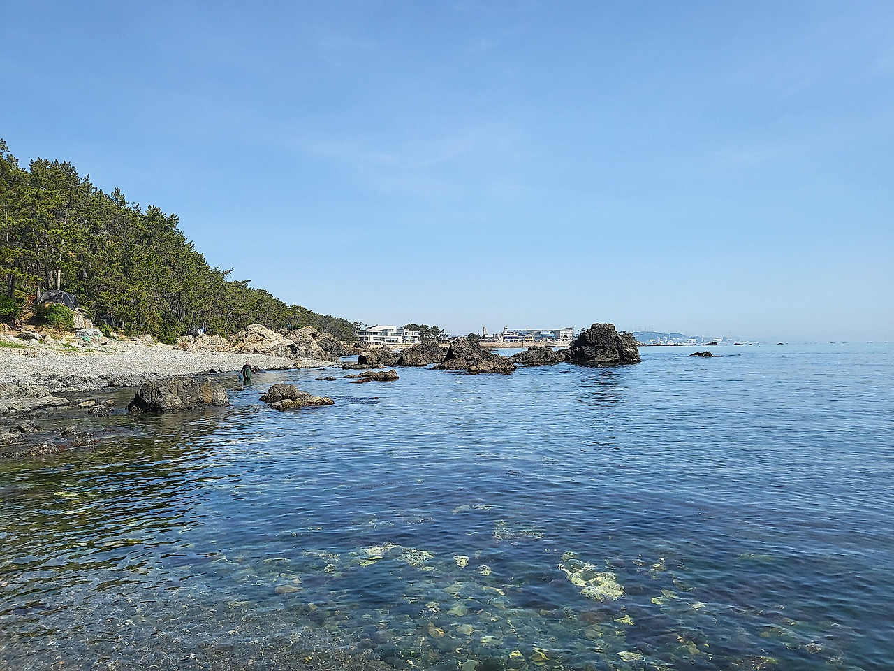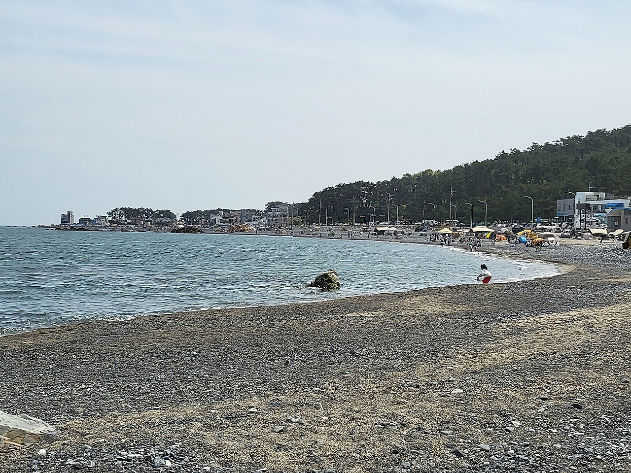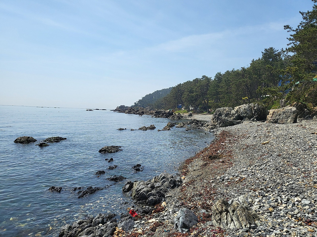 초여름 날씨라서 여름휴가 때처럼 긴 몽돌해변이 텐트로 가득하고, 삼겹살 굽는 냄새가 구수하다.