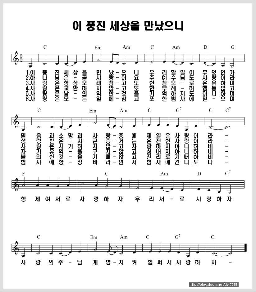 [스크랩] 68. 이풍진세상을 만났으니(서로사랑하자)[악보*찬양*가사] 작성자하남|작성시간14.01.09|조회수1,478 목록 댓글 0 글자크기 작게가 글자크기 크게가 이풍진세상을 만났으니(서로사랑하자)[악보*찬양*가사] 1. 이 풍진 세상을 만났으니 우리 할일이 무엇인가 믿음과 소망과 사랑중에 제일은 사랑이라 형제여 서로 사랑하자 우리 서로 사랑하자 사랑의 주님 계명 지켜 힘 써서 사랑하자 2. 하나님은 곧 사랑이요 주예수님도 사랑이라사랑 받은자 큰 증거는 온전한 사랑이라 형제여 서로 사랑하자 우리 서로 사랑하자사랑의 주님 계명 지켜 힘써서 사랑하자3. 사랑은 항상 오래 참고 또한 참으로 온유하며 사랑은 시기하지 않고 자랑하지 아니하네형제여 서로 사랑하자 우리 서로 사랑하자사랑의 주님 계명 지켜 힘써서 사랑하자4. 사랑은 교만하지 않고 또한 무례히 행동않고 자기 유익을 구치 않고 성내지 아니하네 형제여 서로 사랑하자 우리 서로 사랑하자사랑의 주님 계명 지켜 힘써서 사랑하자5. 사랑은 남의 악한 것을 기억하지도 아니하며 불의한 것을 기뻐 않고 진리로 기뻐하네 형제여 서로 사랑하자 우리 서로 사랑하자사랑의 주님 계명 지켜 힘써서 사랑하자6. 사랑은 모든일에 참고 또한 범사에 믿으며범사에 항상 바라면서 범사에 견디도다형제여 서로 사랑하자 우리 서로 사랑하자사랑의 주님 계명 지켜 힘써서 사랑하자 다음검색 스크랩 원문 : 춘천 대우인력 김진규 현재 게시글 추가 기능 열기 북마크 공유하기 신고 센터로 신고 댓글 댓글 0 댓글쓰기 답글쓰기 댓글 리스트