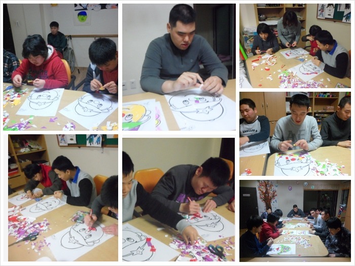 모자이크 여러색깔의 시트지를 잘게 잘라서 조각을 만듭니다 조각들을 그림모형에 붙이며 사물을 표현해 보았답니다 석희씨는 색칠을 하면서 활동에 참여했는데 집중력이 대단합니다
