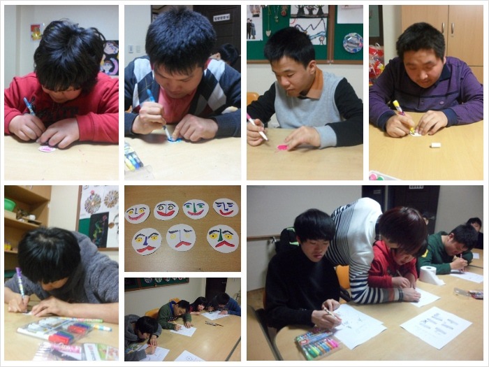 우리에게는 너무나 많은 표정들이 있어요 희노애락 외에도 설명할 수 없는 수많은 표정들이 있는 것 같아요 눈은 웃는데 입술은 올라가고~~등 등 ㅋㅋ 그림으로 표현해 보니 정말 웃긴 모습들이 많았답니다 그래도 우리는 늘 행복한 미소를 지으려고 노력중입니다!!