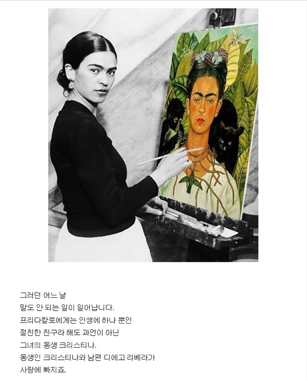 그가 프리다의 여동생과 불륜을 저지르며 견디기 힘든 마음의 상처를 받았지요.