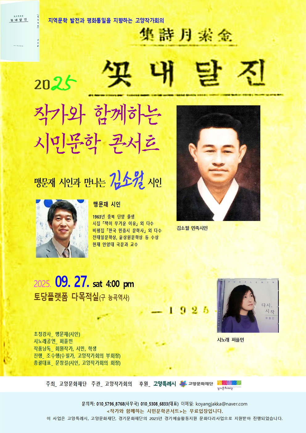 [스크랩] [행사]2025 3회 작가와 함께하는 시민문학 콘서트 -맹문재 시인 초청 김소월 강연 작성자편집실|작성시간25.09.09|조회수8 목록 댓글 0 글자크기 작게가 글자크기 크게가 다음검색 스크랩 원문 : 고양작가회의 현재 게시글 추가 기능 열기 북마크 공유하기 신고 센터로 신고 댓글 댓글 0 댓글쓰기 답글쓰기 댓글 리스트