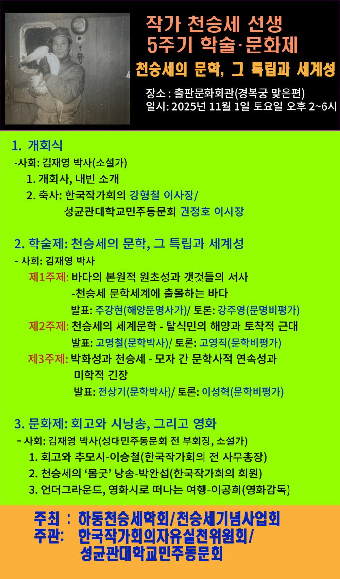 천승세 선생 5주기 학술 문화제 작성자편집실|작성시간25.10.29|조회수8 목록 댓글 0 글자크기 작게가 글자크기 크게가 다음검색 현재 게시글 추가 기능 열기 북마크 공유하기 신고 센터로 신고 댓글 댓글 0 댓글쓰기 답글쓰기 댓글 리스트