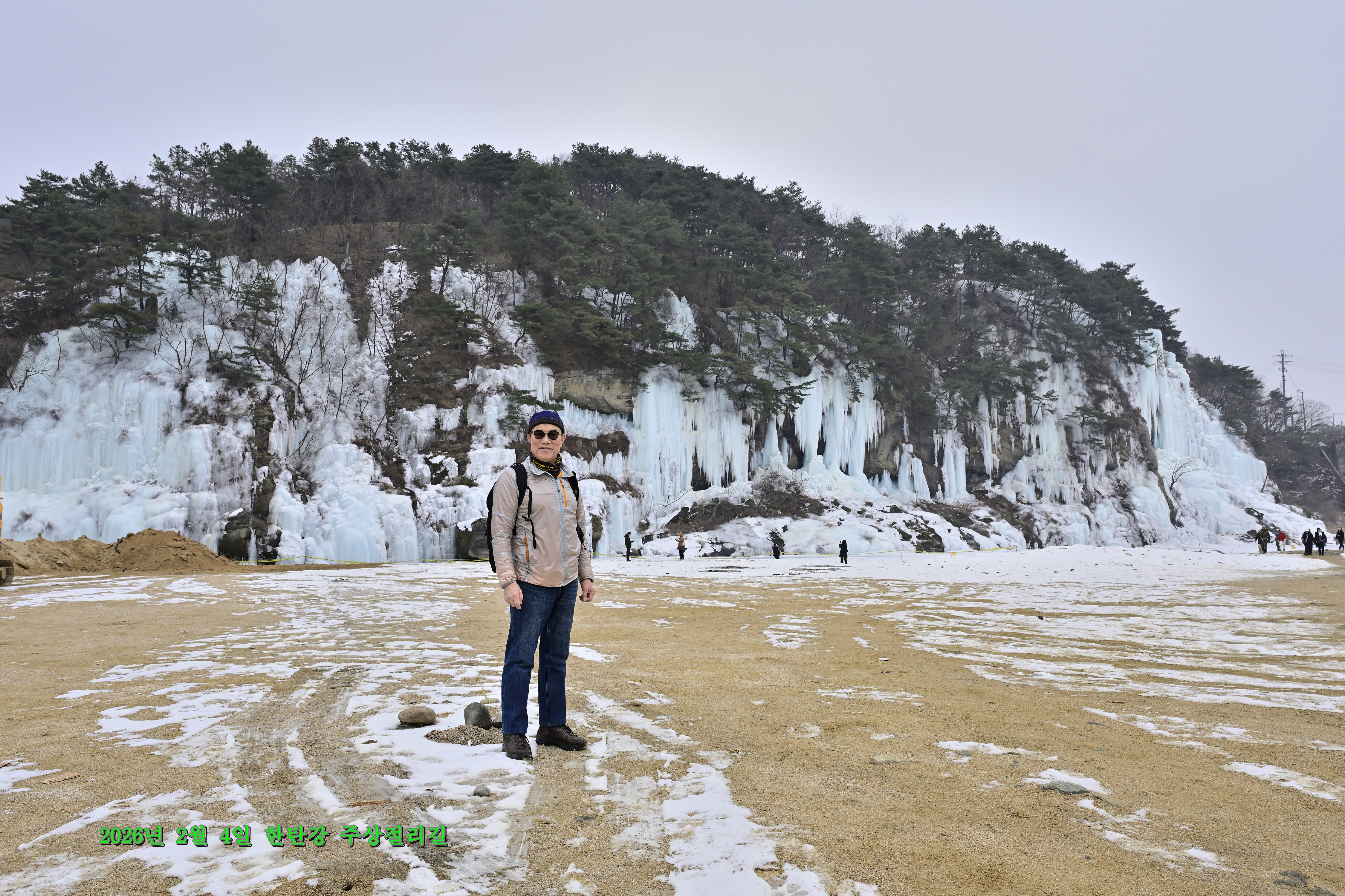 가든길을 멈추고 얼음 폭포 앞에서 첫 인정 사진을 남긴다.