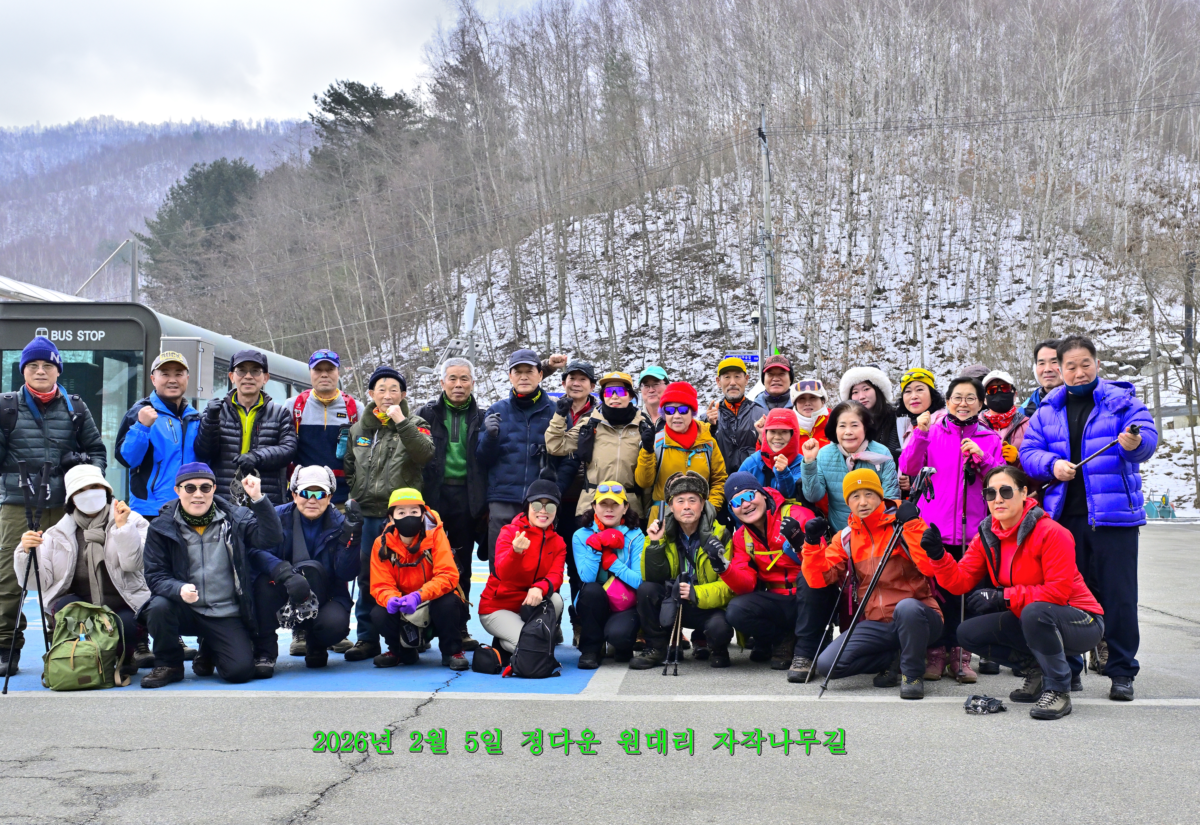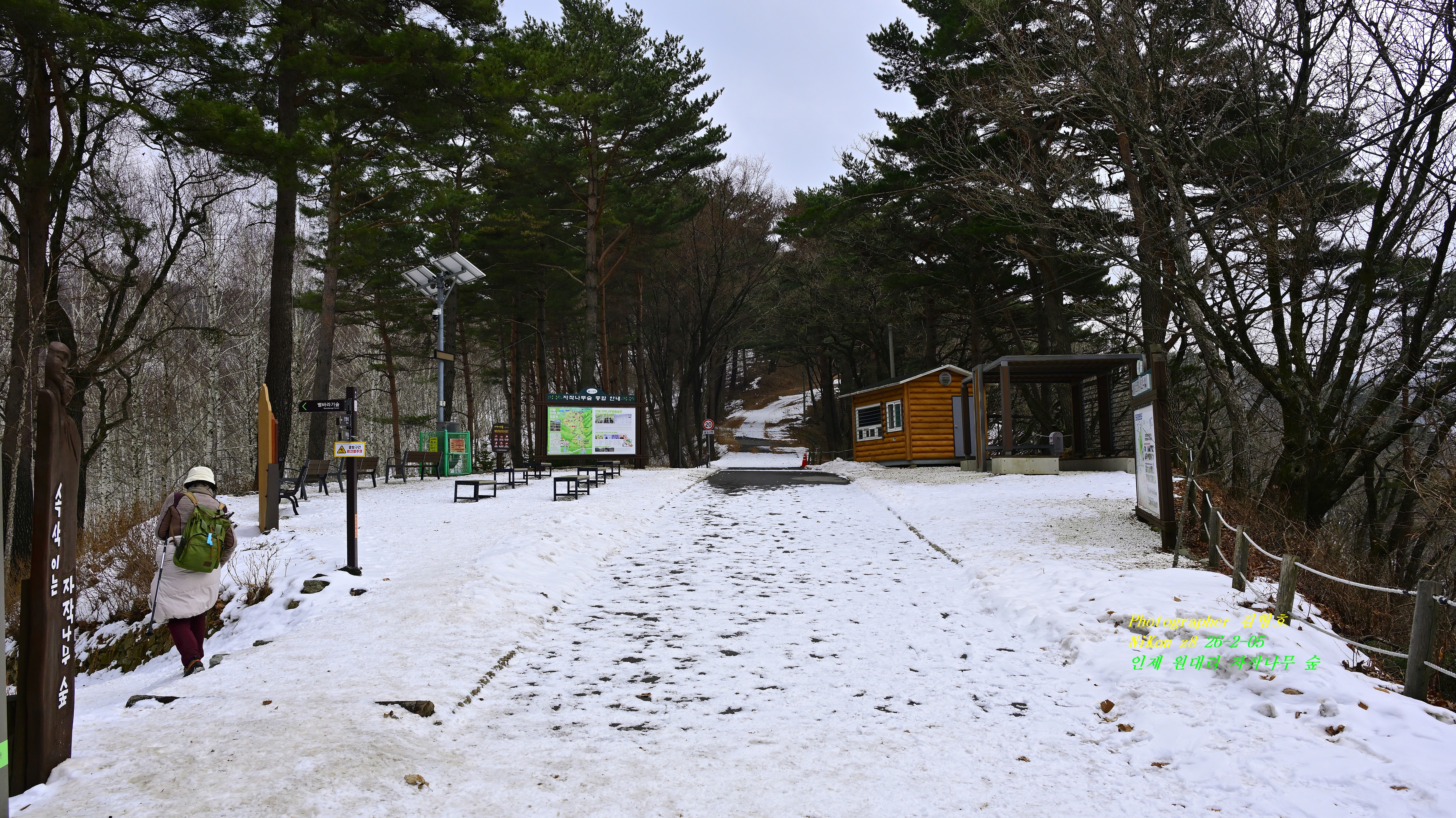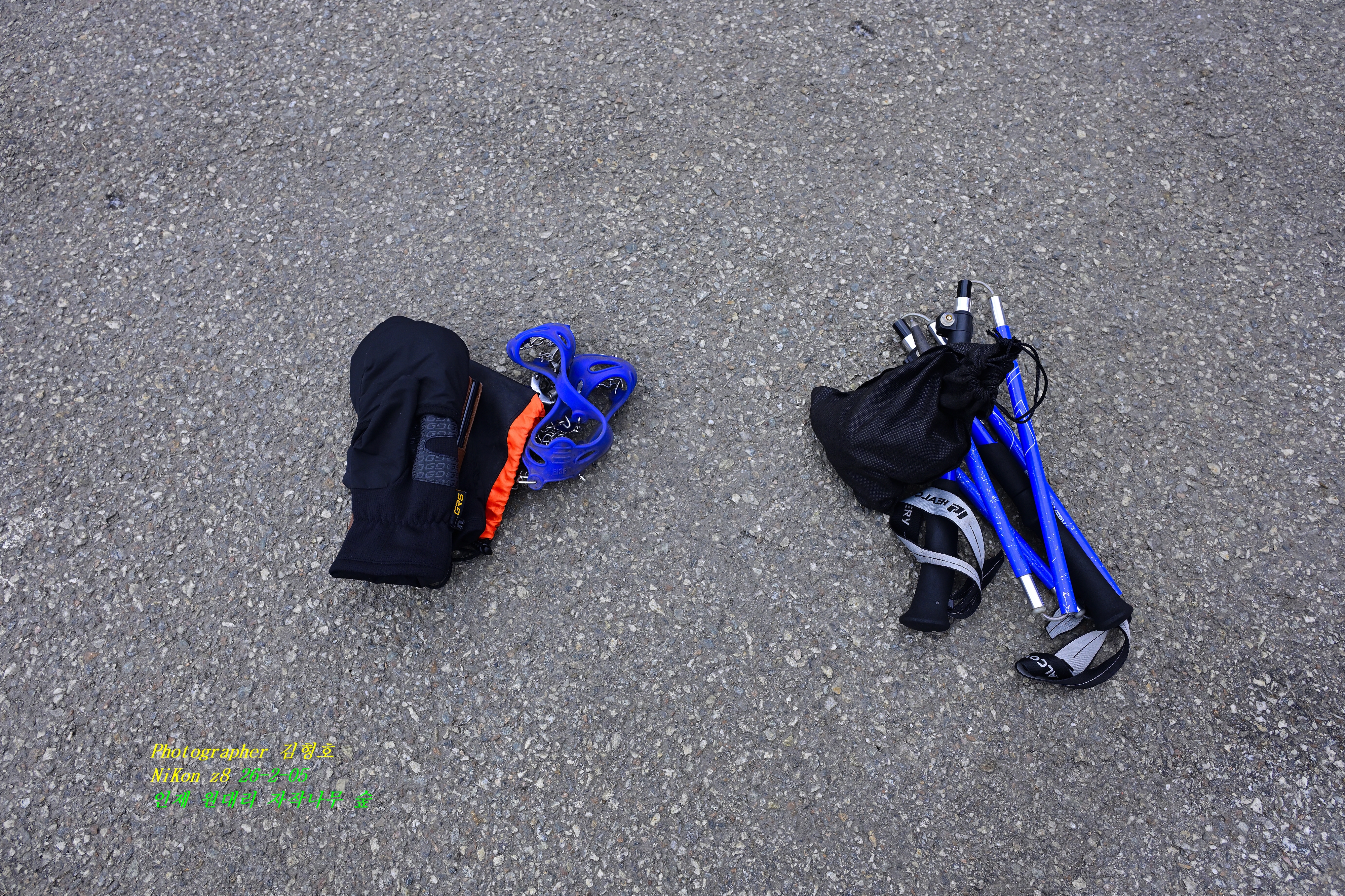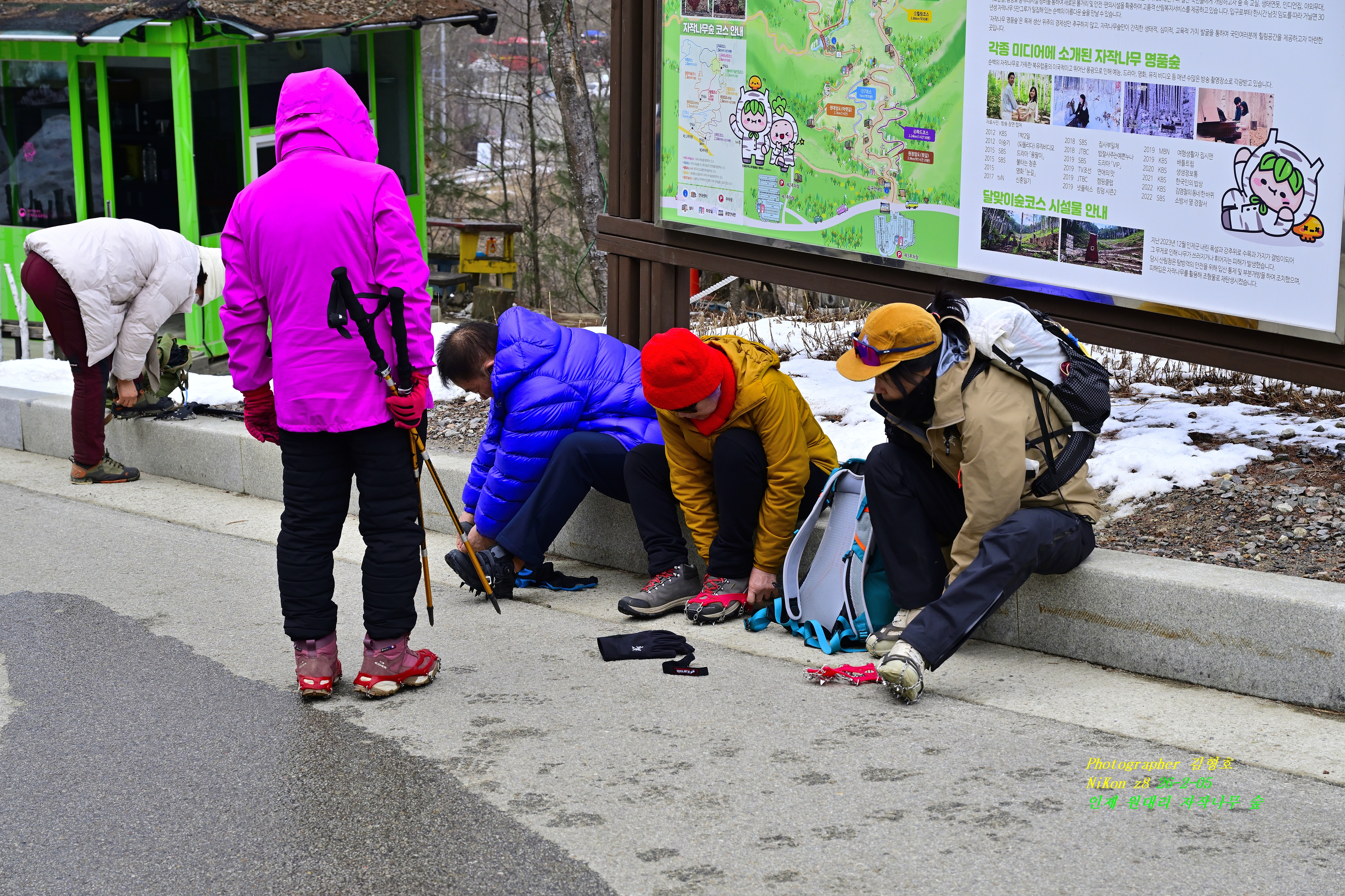 음식점에서 2시간 걸려서 원대리 자작나무 숲길 주차장에 도착을 하여 아이젠 , 스틱을 준비를 한다. 스틱은 없어도 되지만 아이젠을 가지고 오지 않으면 자작나무 숲길에 갈 수가 없다고 한다. 누군가가 보란 듯이 아이젠과 스틱을 바닥에 놓아두었다. 간편한 아이젠은 주차장 매점에서 돈만주면 쉽게구할 수가 있는듯 하다.