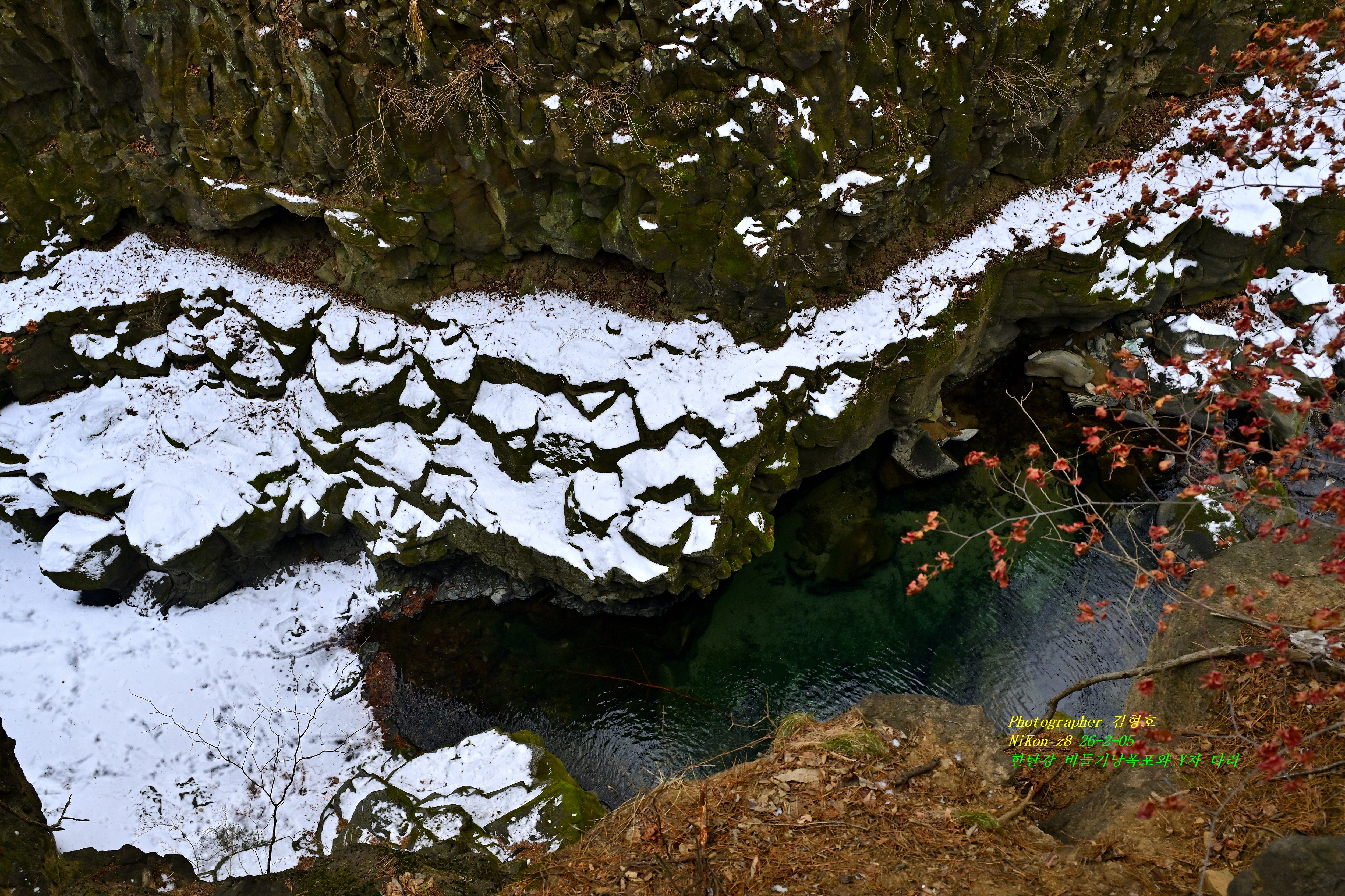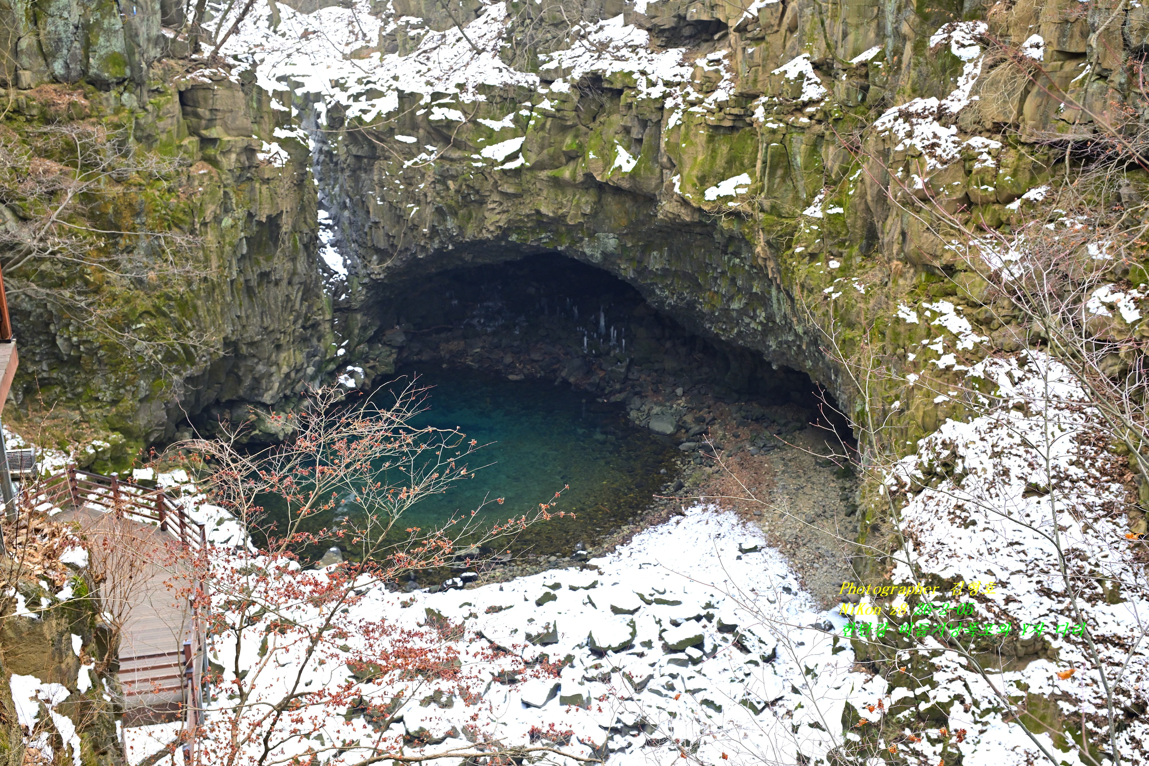 이곳 비둘기낭 폭포는 유명한 곳이다. 사진가들이 우기 때 찍은 사진들로 널리 알려져 있는 폭포다. 겨울이라서 수량이 없어서 너무너무 아쉽지만 이 한 장으로도 나도 이곳에 와 보았다는 자부심을 가지고 이곳을 떠날 수밖에 없었다. 겨울이고 너무 일찍 와서 그런지 밑으로 갈 수 있는 길이 차단되어서 내려갈 수가 없었다.