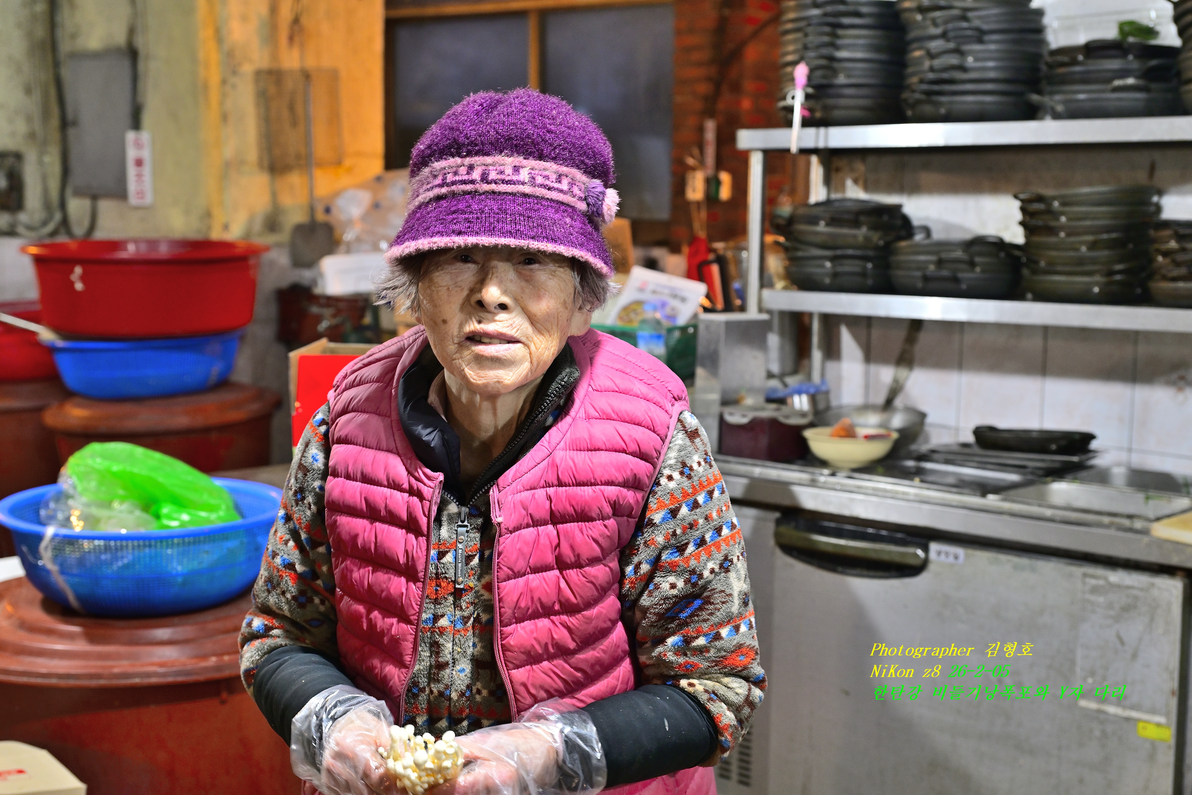 유명한 할머니는 흐르는 세월 앞에 장사가 없듯이 귀도 가시고 그래도 손끝에는 작은 버섯을 매만지며 다듬고 계셨다. 아침 일찍인지 할머니와 아들 됨직한 두 분이 열심히 음식을 만들고 나르고 하셨다. 그냥 갈 수가 없어서 아드님께 허락을 받고 이렇게 한 장의 사진을 남기게 되었다.