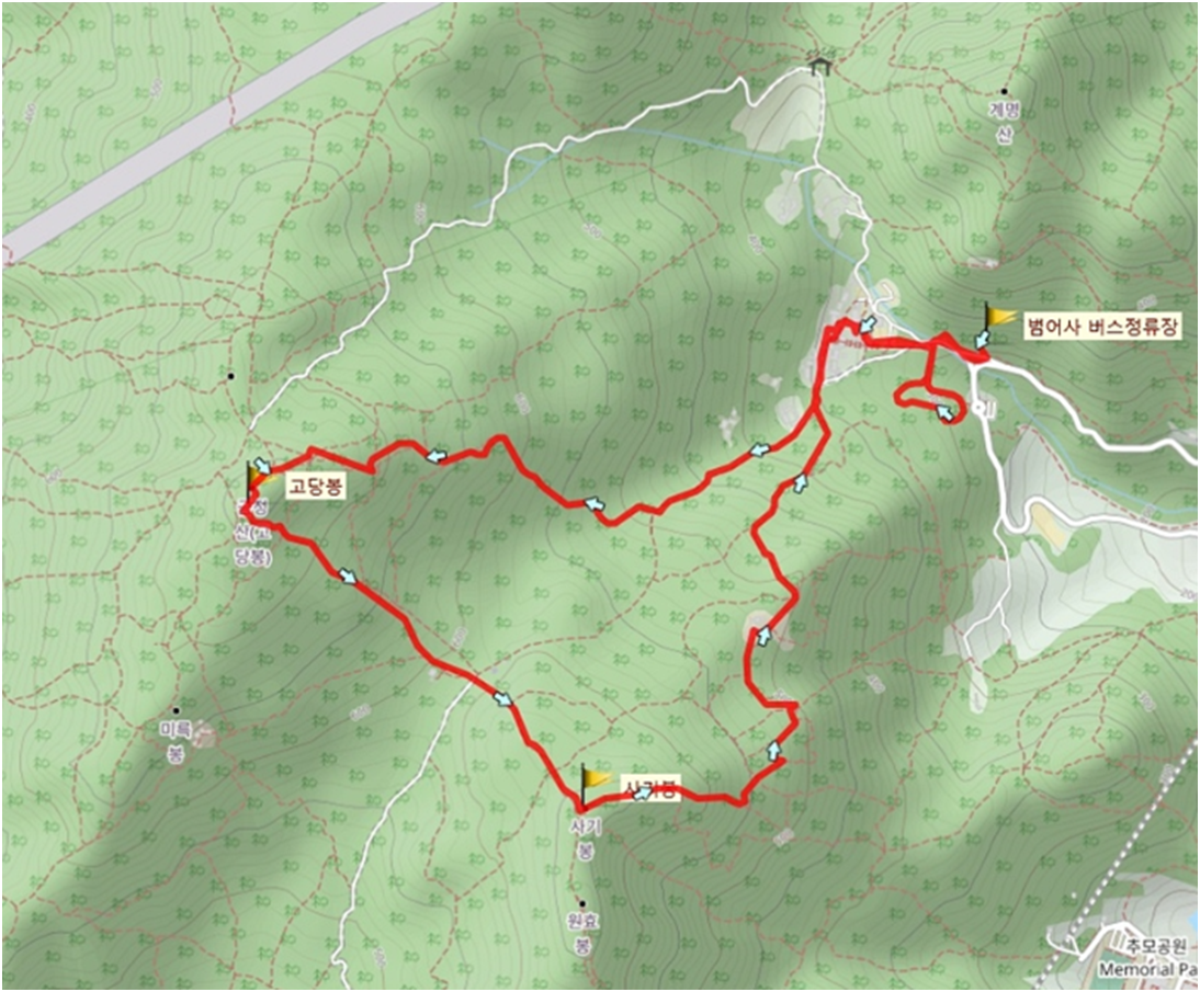 B코스 : 주차장-범어사-청련암-금정산(고당봉)-북문-사기봉-용담서원-만성암-주차장 9km