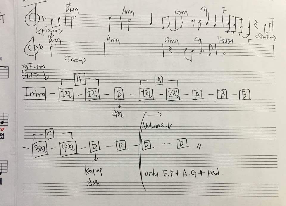 가사도 코드도 각자가 적으며.. 그때 그때 달라지는 부분을 그려 놓은 것이라 일정치가 않았었어요