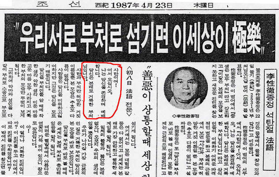 이 글은 대한불교 조계종 종정 ‘1987년(불기2531년)음력4월8일’에 발표된 법어(法語)를 수록한‘이성철 큰스님의 큰 빛 큰 지혜(思社硏:사상 사회 연구소 : 1987.6.30(중판))’에 출전되어 있다. 대한불교 조계종 종정사서실 [큰빛총서 1] – 서울사시연 1994년 p. 56-59 (조선일보 1987.4.23 7면, 경향신문 1987 4.23 9면)